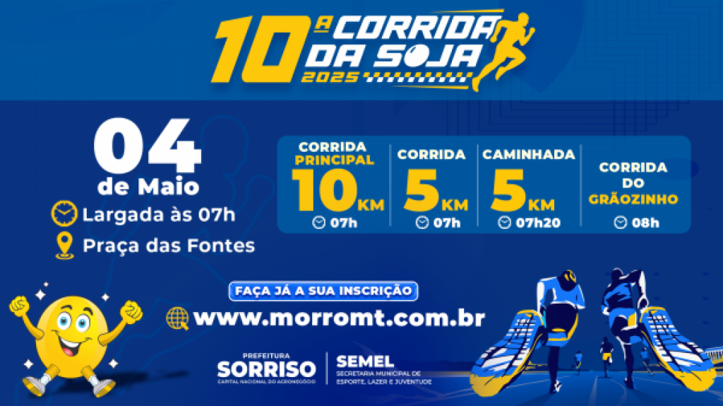 A Prefeitura de Sorriso realiza, no dia 4 de maio, a 10ª edição da Corrida da Soja,. Com a largada em frente ao Ginásio Domingão, na Praça das Fontes, o evento é promovido pelas secretarias municipais de Esporte, Lazer e Juventude e de Saúde e Saneamento, com apoio da Associação Sorrisense de Atletismo e da Federação Mato-grossense de Atletismo.