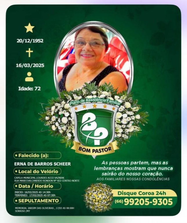 Servidora aposentada faleceu neste domingo, deixando uma grande contribuição para a educação sorrisense A Prefeitura manifesta seu pesar pelo falecimento de Erna de Bairros Scheer,