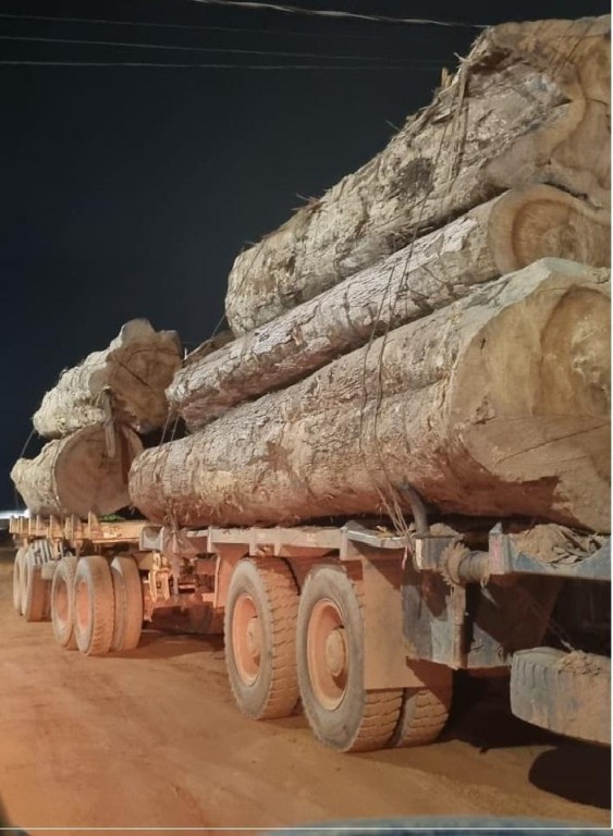 Um caminhão carregado com 10 toras gigantes de madeira ilegal, foi apreendido pela Polícia Civil, no município de Juína, durante fiscalização da Delegacia Especializada do