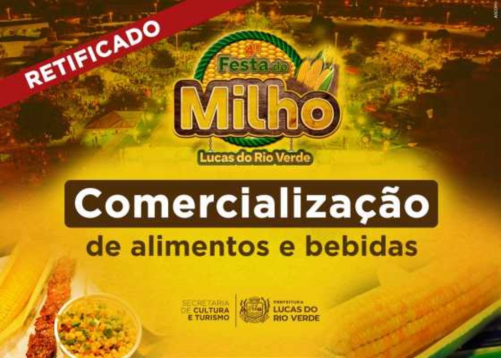 A Prefeitura Municipal de Lucas do Rio Verde, por intermédio da Secretaria de Cultura e Turismo, torna pública a Retificação nº 01 e nº 02 do Edital de Seleção nº 001/2025, referente à seleção de participantes para a Comercialização de Alimentos para a 4ª Festa do Milho.