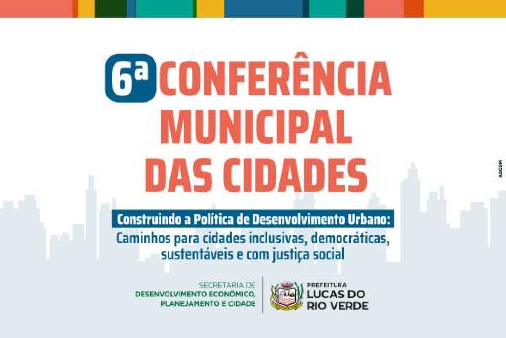 A Prefeitura de Lucas do Rio Verde, por meio da Secretaria Municipal de Desenvolvimento Econômico, Planejamento e Cidade, em conjunto com o Conselho Municipal da Cidade, realizará a 6ª Conferência Municipal das Cidades no dia 26 de junho. O evento acontecerá no Auditório dos Pioneiros, localizado no Paço Municipal, a partir das 7h30, com credenciamento e café da manhã de boas-vindas.
