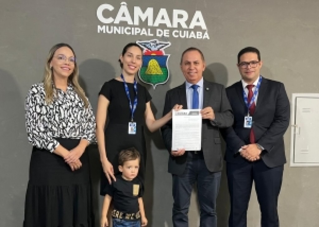 A foto ilustra um grupo de estudantes vestidos com uniforme oficial da Prefeitura de Cuiabá. No fundo, há uma tela azul indicando que se trata de um evento de robótica educacional.