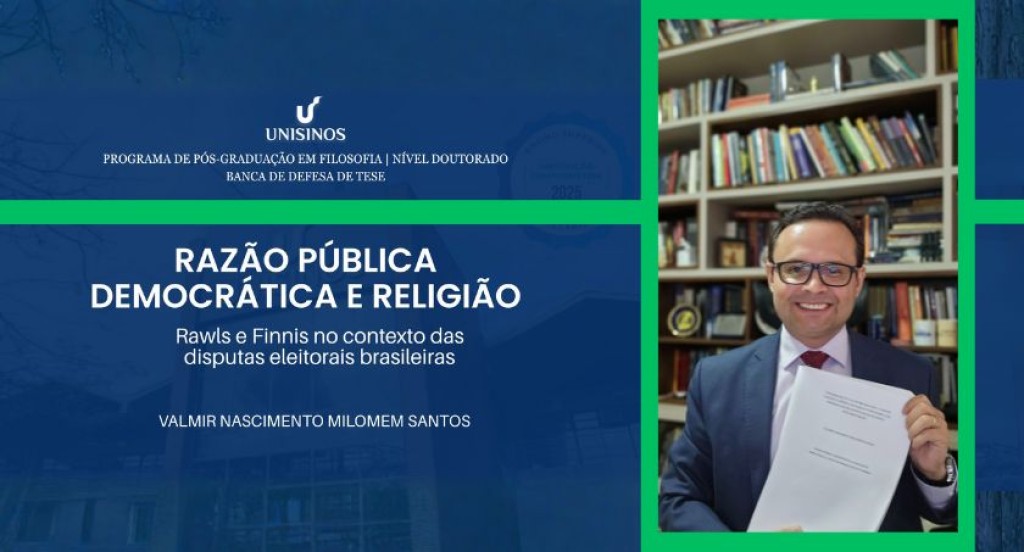 #PraTodosVerem – A imagem divulga a defesa de tese de doutorado de Valmir Nascimento Milomem Santos no Programa de Pós-Graduação em Filosofia da Unisinos. O título do trabalho é “Razão Pública Democrática e Religião: Rawls e Finnis no contexto das disputas eleitorais brasileiras”. À direita, o pesquisador aparece sorridente, segurando o exemplar da tese, diante de uma estante repleta de livros.