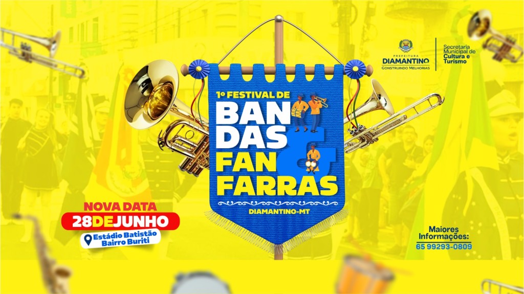 Promovido pela Prefeitura de Diamantino, por meio da Secretaria Municipal de Cultura e Turismo, o 1º Festival de Bandas e Fanfarras, reunirá diversas Bandas e Fanfarras de diferentes municípios do estado. O evento tem nova data e será realizado no dia 28 de junho (sábado), no Estádio Batistão, no bairro Buriti.