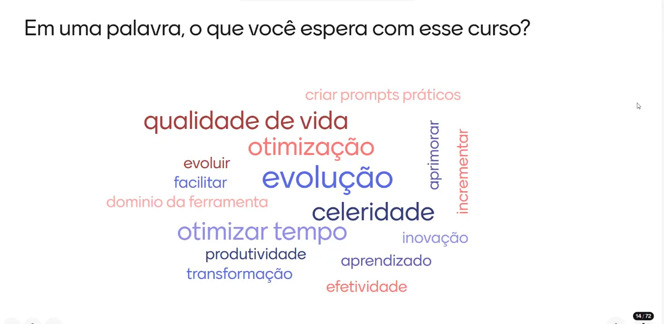 Ao final da capacitação, os servidores foram convidados a responder à pergunta: “Em uma palavra, o que você espera com esse curso?”. As respostas, transformadas em nuvem de palavras, revelaram os principais anseios do grupo: inovação, produtividade, celeridade, qualidade de vida, domínio da ferramenta e transformação.