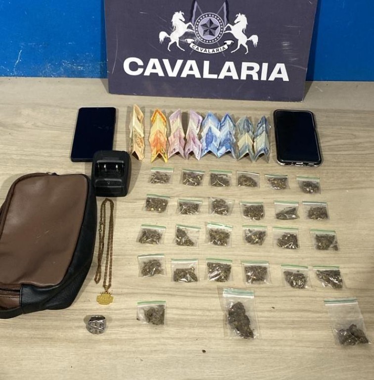 Ao abordar o suspeito, os policiais encontraram três porções de maconha. Em relato à PM, ele afirmou ser apenas usuário e disse que as substâncias pertenciam ao primo, com quem mora. A equipe entrou na residência e, durante buscas, localizou mais 24 porções de maconha e R$ 108,00 em dinheiro.