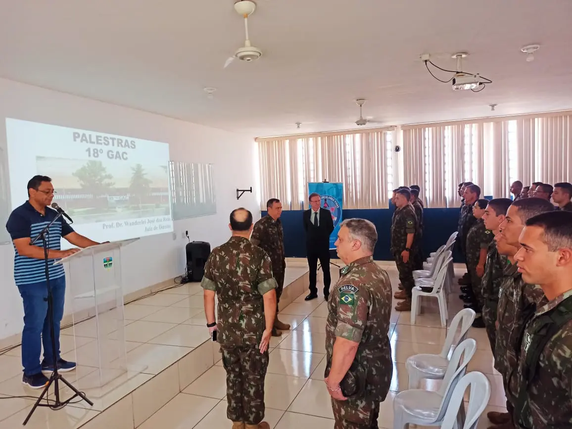 A atividade ocorreu na manhã do dia 6 de novembro, no 18º Grupo de Artilharia de Campanha (GAC) em Rondonópolis, e contou com a presença do comandante da unidade militar, tenente-coronel Deivid Neto de Oliveira, integrando a agenda de ações educativas do Cejusc local durante a XX Semana Nacional da Conciliação.