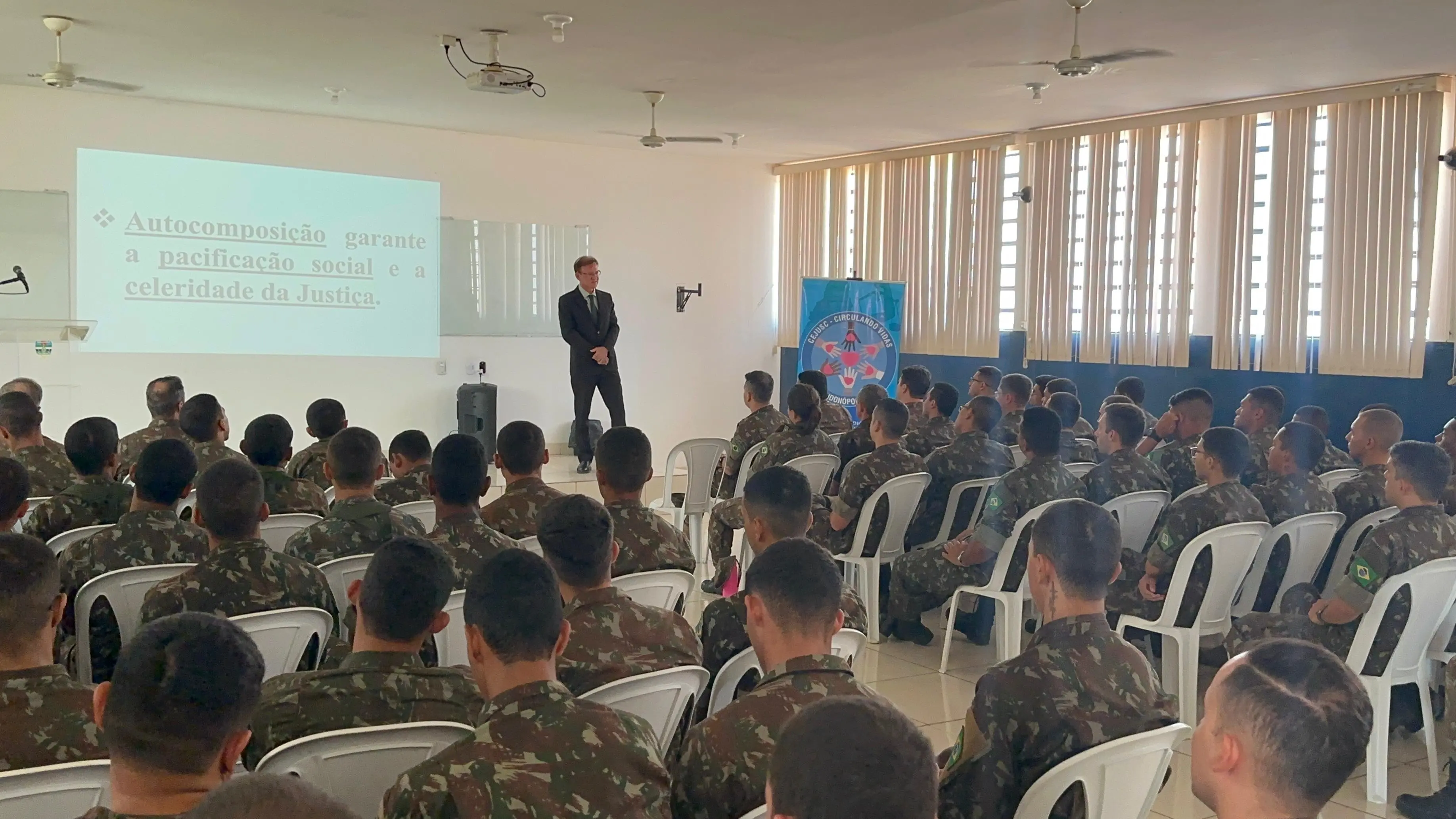 Em um movimento histórico que perpassa os limites do Fórum e reforça o compromisso do Poder Judiciário de Mato Grosso (TJMT) com a difusão da cultura da paz em todos os segmentos sociais, o Centro Judiciário de Solução de Conflitos e Cidadania (Cejusc) de Rondonópolis, sob coordenação do juiz Wanderlei José dos Reis, realizou uma palestra para militares do Exército Brasileiro.