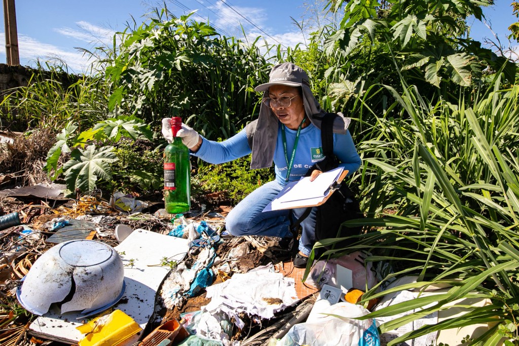 A imagem mostra uma agente de saúde durante uma fiscalização em um terreno baldio. A servidora segura uma garrafa de vidro nas mãos, que serve como criadouro do mosquito da dengue. Também é possível observar muito lixo descartado de forma irregular no local.