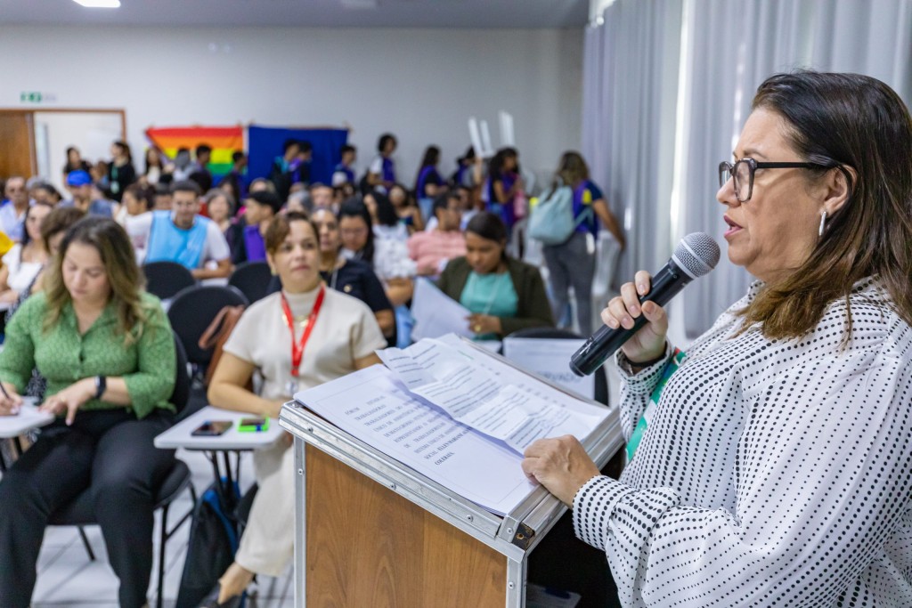 Na imagem principal está a secretária Hélida no primeiro plano com um microfone discursando e abrindo oficialmente os trabalhos da 15ª Conferência do SUAS. Ao fundo estão dezenas de servidores ouvindo atentamente as palavras da representante do poder executivo municipal.