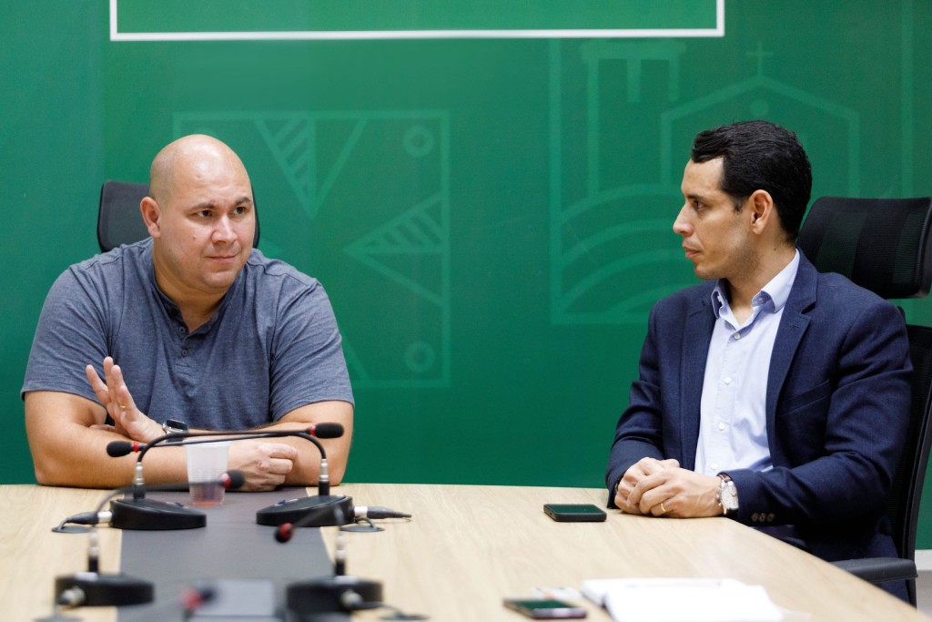 Na imagem o prefeito está ao lado do secretario interino William Campos conversando, em uma mesa de reunião do Salão Nobre da prefeitura.