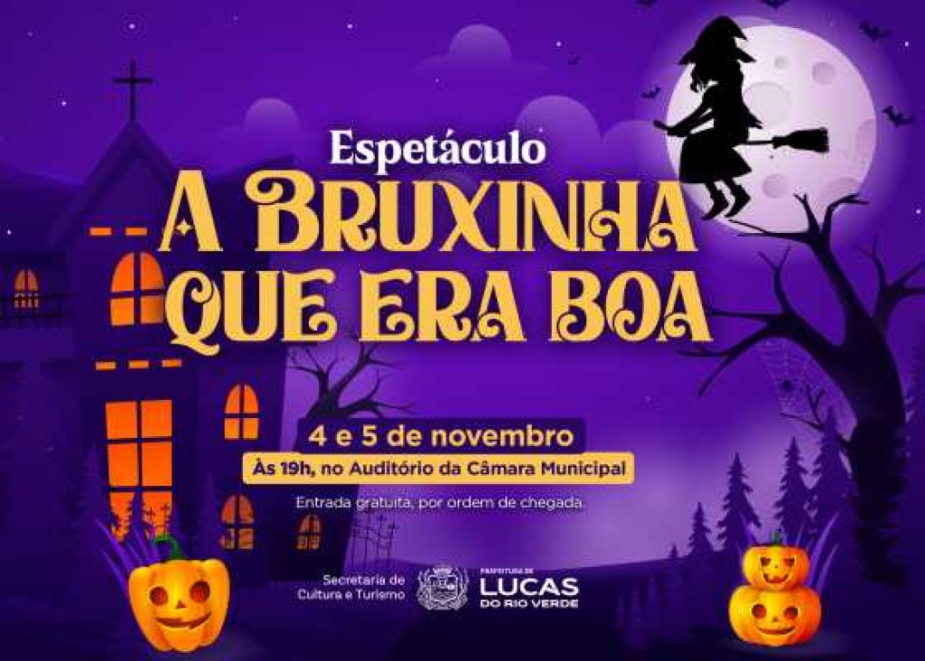 A Prefeitura de Lucas do Rio Verde, por meio da Secretaria de Cultura e Turismo, realizará nos dias 4 e 5 de novembro, às 19h, na Câmara de Vereadores, a apresentação do espetáculo “A Bruxinha que Era Boa”, uma