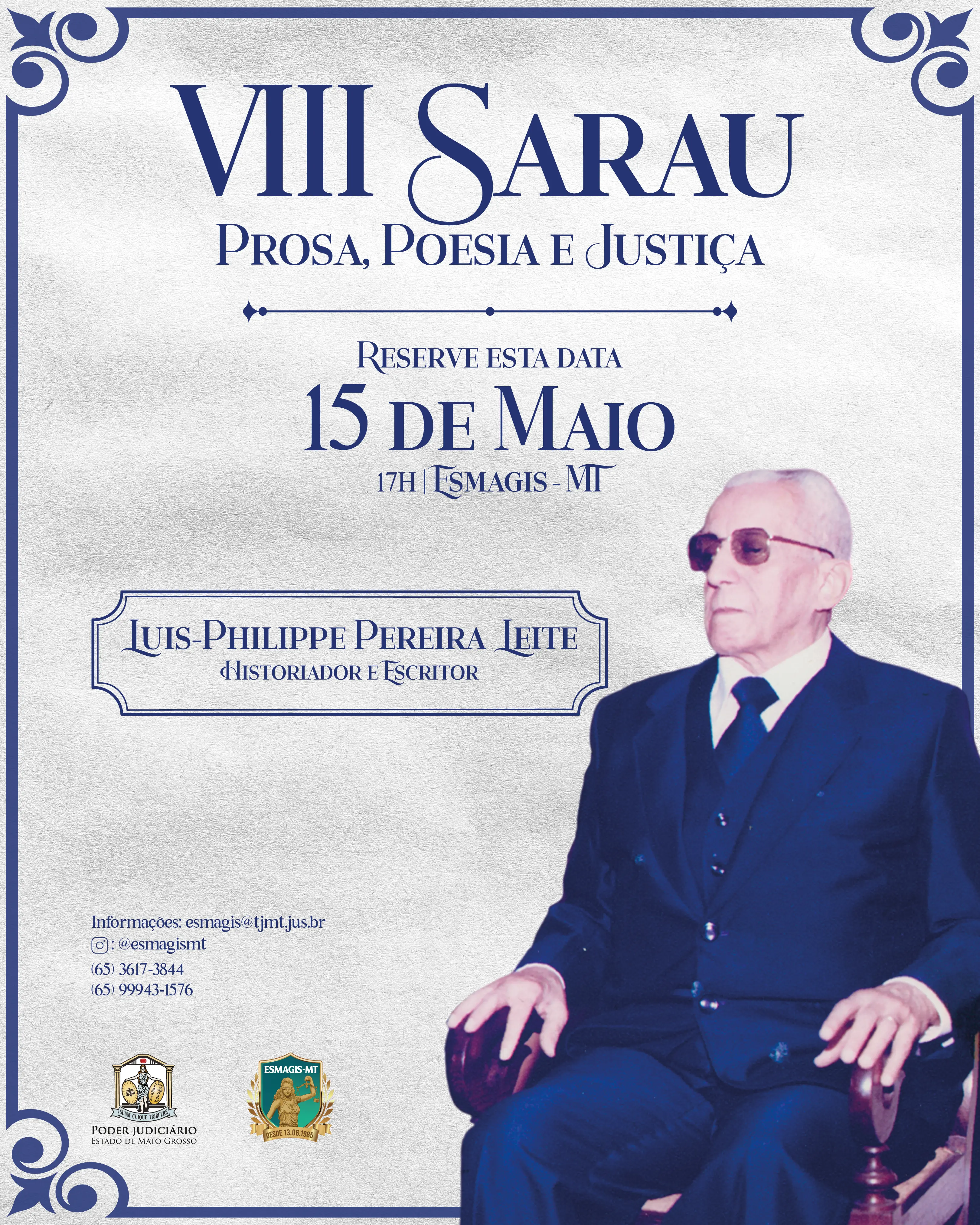 A Escola Superior da Magistratura de Mato Grosso (Esmagis-MT) realizará, no dia 15 de maio de 2026, das 17h às 20h, o “8º Sarau Prosa, Poesia e Justiça”, evento cultural já consolidado no calendário institucional. A atividade será presencial, na sede da Escola, e reunirá magistrados(as) do Poder Judiciário de Mato Grosso, convidados e instituições parceiras.