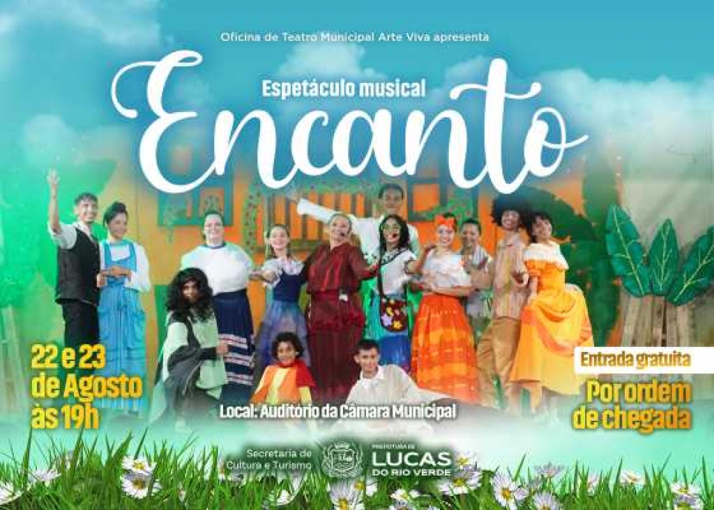 A Prefeitura de Lucas do Rio Verde, por meio da Secretaria de Cultura e Turismo, convida a comunidade para viver momentos de arte, emoção e encantamento nesta sexta e sábado (22 e 23 de agosto). O Espetáculo Encanto terá duas apresentações, ambas às 19h, no auditório da Câmara Municipal.