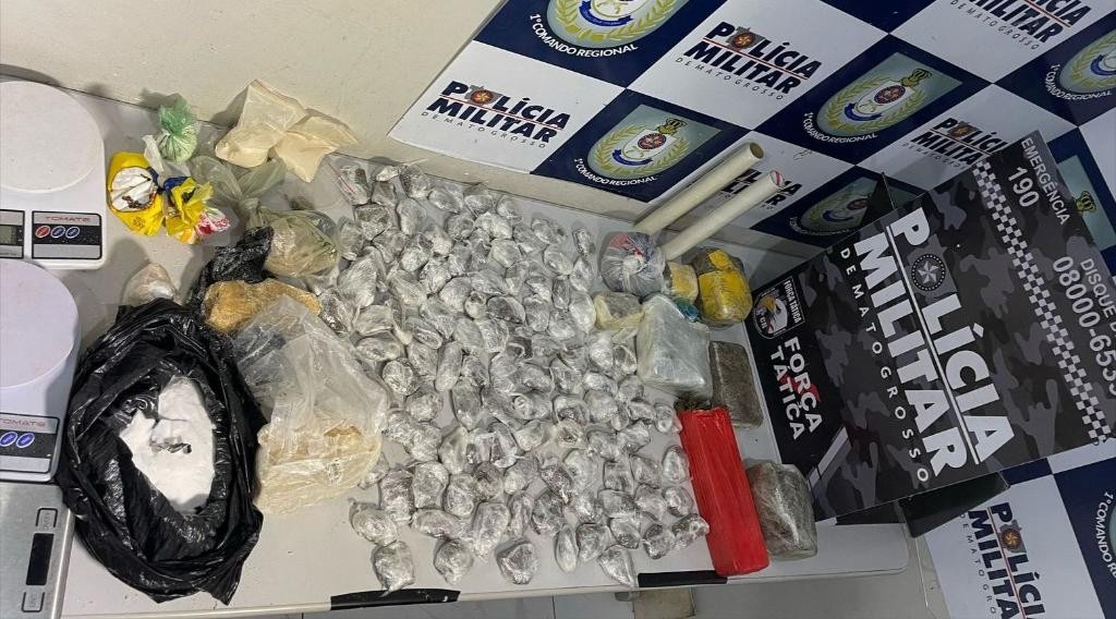 Policiais militares da Força Tática do 1º Comando Regional prenderam dois jovens, de 19 e 23 anos, por tráfico ilícito de drogas, no final da tarde desta quarta-feira (16.4), em Cuiabá. Com a dupla, foram apreendidos 120 porções e tabletes de substâncias análogas de maconha, cocaína e pasta base de cocaína.
