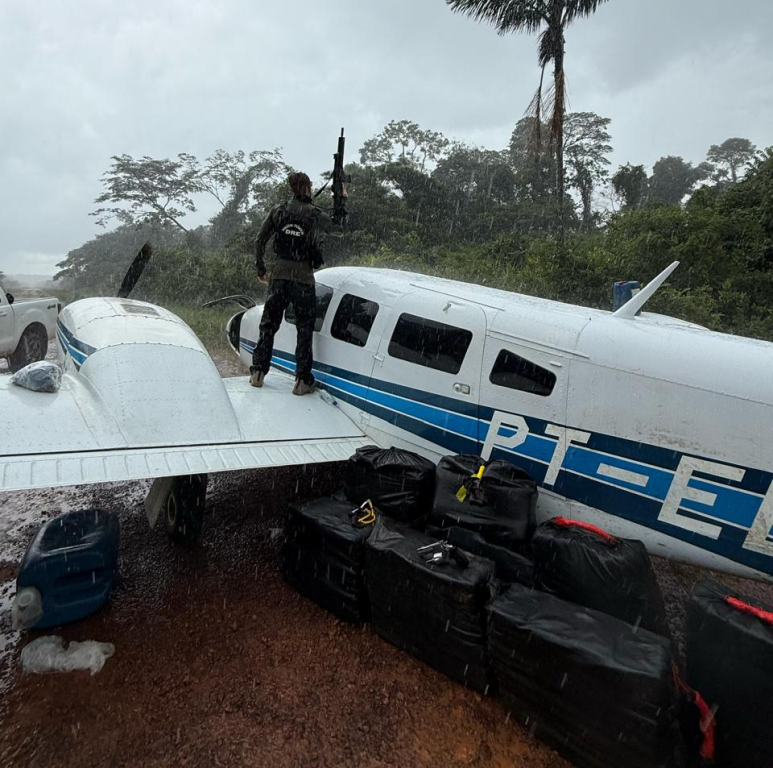 A droga estava dividida em 12 fardos e foi localizada na aeronave após troca de informações entre as forças de segurança na região entre os estados de Mato Grosso e Rondônia. Além do entorpecente, foi apreendida uma arma de fogo com seis munições intactas. O piloto conseguiu fugir e está sendo procurado.