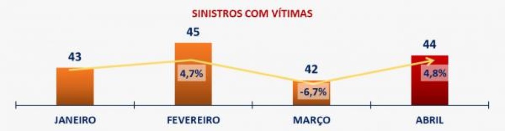 Os meses com maior número de acidentes com vítimas foram fevereiro com 45 registros e abril com 44 situações. Março com 69 registros foi registrou o maior número de ocorrências sem vítimas.
