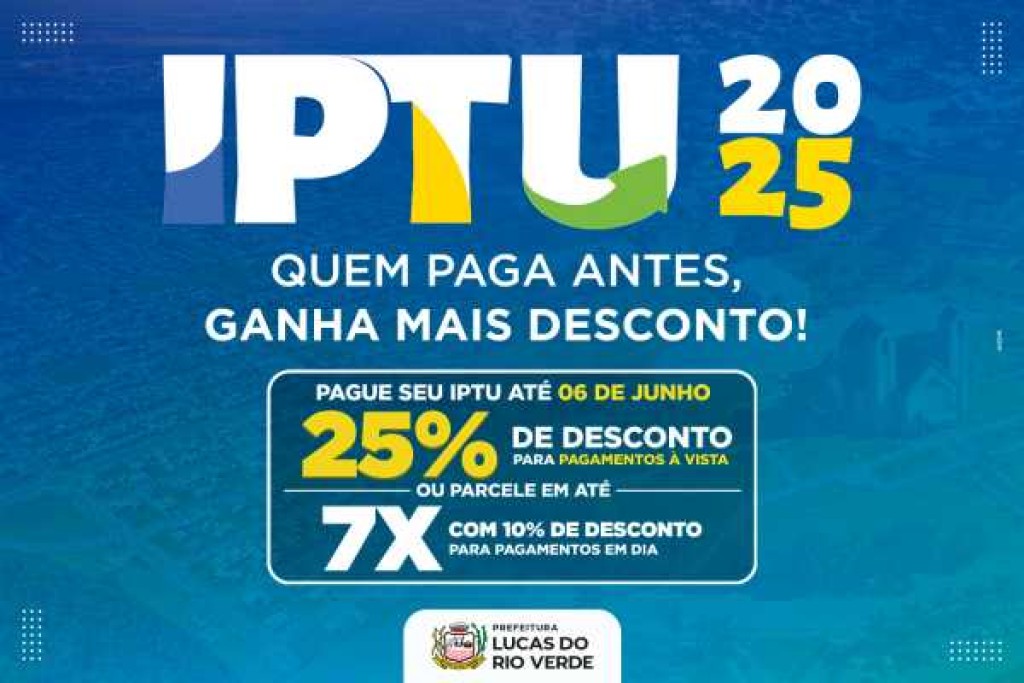A campanha de arrecadação do Imposto Predial e Territorial Urbano – IPTU 2025 já está em vigor em Lucas do Rio Verde. Conforme a Lei Nº 33/2025, o contribuinte que fizer o pagamento em cota única, até o dia 06 de junho, poderá ter a dedução de 25% do valor do imposto.