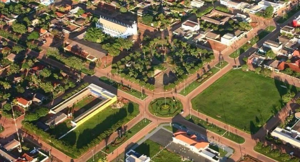 #PraTodosVerem: A imagem mostra uma vista aérea da cidade de Brasnorte, com um traçado urbano organizado. No centro, há uma grande praça arborizada em formato circular, com ruas radiais que se conectam ao entorno. Ao redor, é possível ver casas, áreas verdes e alguns prédios maiores, incluindo uma construção branca de destaque, semelhante a uma igreja ou prédio público.