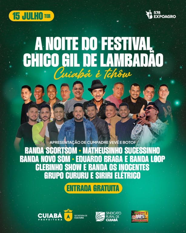 Com uma programação vibrante e recheada de talento, o Festival do Lambadão na Expoagro será um momento único de exaltação à identidade cuiabana. Será uma noite para sentir orgulho, dançar, se emocionar e fortalecer o vínculo com as tradições que fazem de Cuiabá uma cidade ainda mais calorosa.