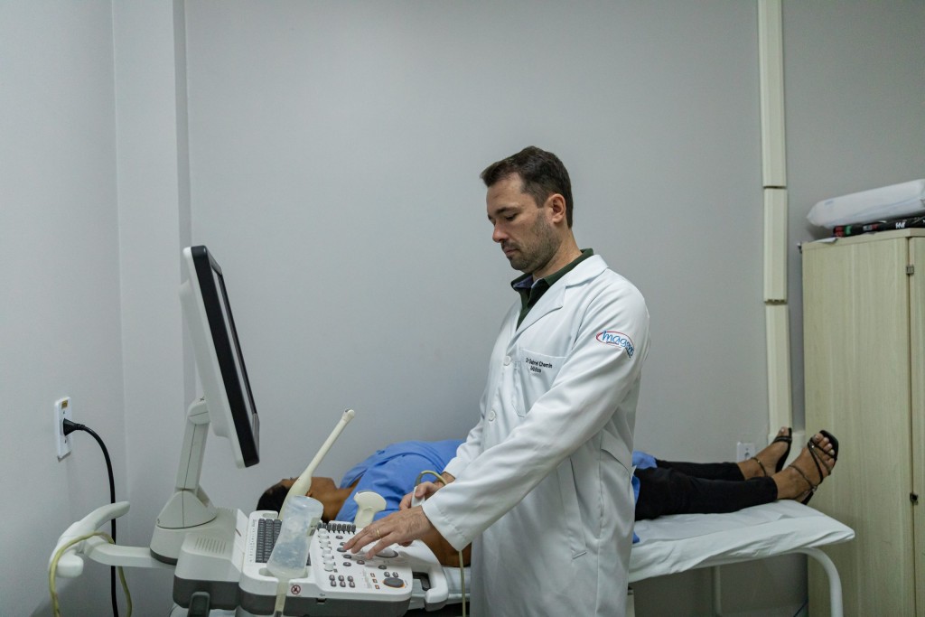 A foto mostra o médico radiologista Gabriel Chemin atendendo uma das pacientes no Hospital São Benedito.