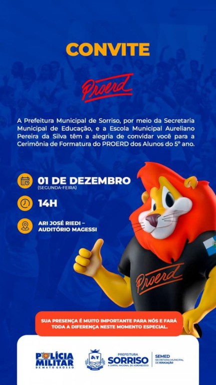 Na próxima segunda-feira (1º) é dia de formatura dos alunos do Programa Educacional de Resistência às Drogas e à Violência (Proerd) da Escola Municipal Aureliano Pereira da Silva. A cerimônia será as 14 horas, no auditório Magessi, no Centro de Eventos Ari José Riedi.
