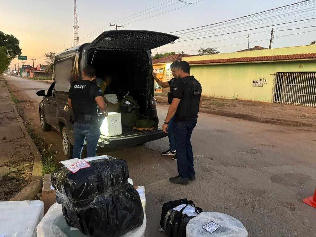 Durante diligências, os policiais civis abordaram um veículo Fiat Strada, de propriedade de uma empresa de transporte de encomendas express, no bairro Jardim Paraíso, em Cáceres.