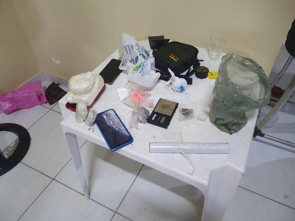 Na ocasião, foram apreendidos diversas porções de substância análoga à maconha e à cocaína, várias unidades de ecstazy, três balanças de precisão e um rolo de plástico filme.