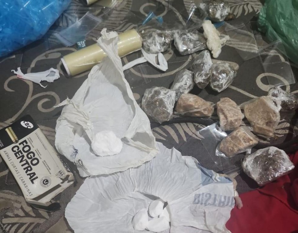Diante disso, a equipe perguntou ao conduzido se havia possibilidade de averiguação no referido local. No interior da residência foram localizados aproximadamente 300g de maconha, cerca de 130g de crack, 18 porções de crack embaladas, aproximadamente 40g de cocaína, cerca de 1 mil eppendorfs (pinos para embalo de cocaína), aproximadamente 300 sacos zip, um dichavador, uma balança de precisão, um revólver calibre .38, 27 munições intactas calibre .38, dois aparelhos celulares, R$ 131 em espécie, três botijões de gás, e outro molho de chaves.