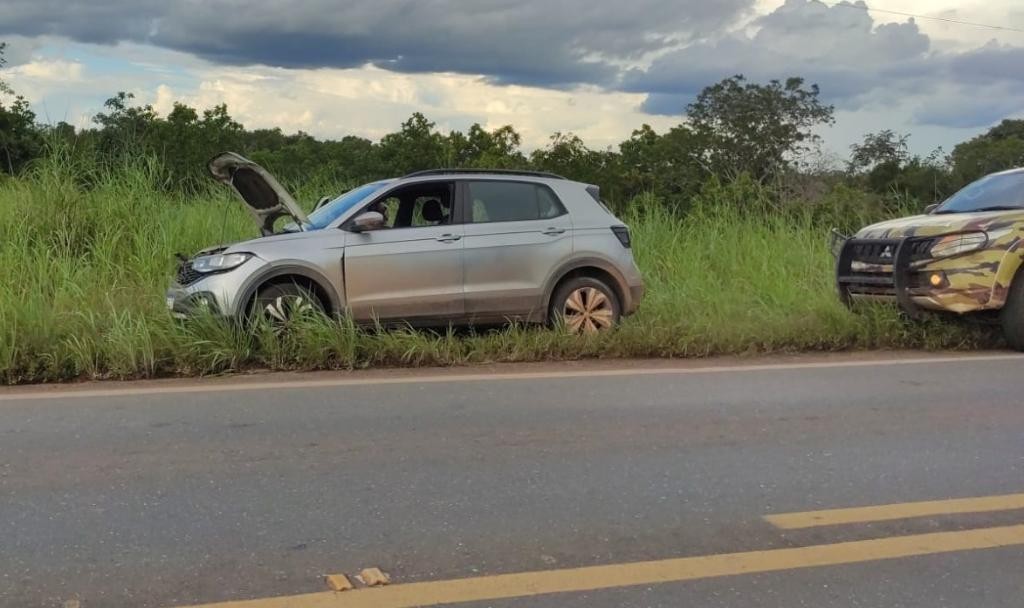 O veículo VW/T-Cross, ano 2023/2024, que possivelmente seria levado pelos criminosos para a região de fronteira, foi localizado às margens da Rodovia Helder Cândia, próximo ao distrito de Nossa Senhora da Guia, após troca de informações entre as equipes da Polícia Civil, com apoio da Patrulha Rural do 10º Batalhão da Polícia Militar.