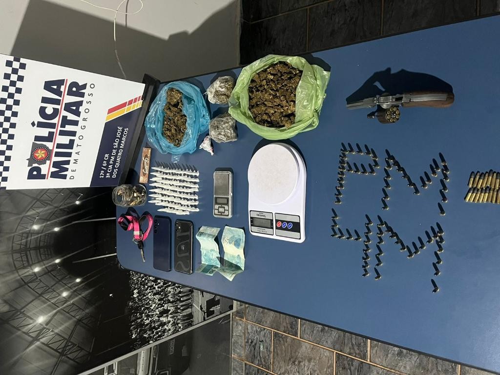 Policiais militares da 3ª Companhia Independente prenderam dois homens, de 23 e 25 anos, por tráfico ilícito de drogas e porte ilegal de arma de fogo, na noite desta quarta-feira (24.9), em São José dos Quatro Marcos. Com os suspeitos, foram encontrados um revólver calibre .22 e 107 munições do mesmo calibre, 99 porções de cocaína, uma sacola com uma grande quantidade de maconha e a uma quantia de R$ 509 em dinheiro.