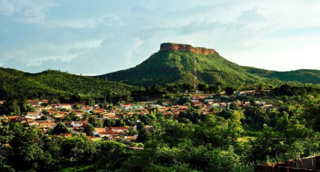 #PraTodosVerem – A imagem mostra uma paisagem natural e urbana da cidade de Poxoréu, no estado de Mato Grosso, tendo ao fundo o imponente Morro da Mesa, uma formação rochosa de topo plano e coberta por vegetação. À frente, vê-se a cidade com casas de telhados avermelhados cercadas por áreas verdes, enquanto uma torre de comunicação se destaca no meio do cenário. A composição ressalta a integração entre natureza e urbanização em um ambiente de relevo característico e exuberante.