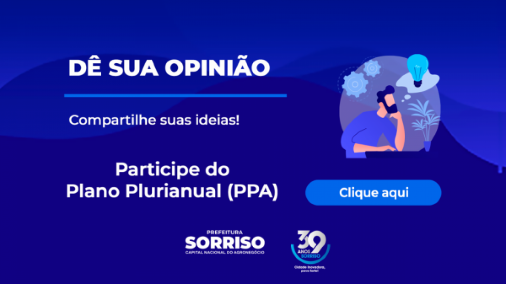 No dia 29 de julho (terça-feira), a Prefeitura promove audiência pública para apresentação do Plano Plurianual 2026-2029. O evento será realizado às 8h, no Auditório Farroupilha, do Centro de Eventos Ari José Riedi, e transmitido pelo canal da Prefeitura de Sorriso no YouTube.