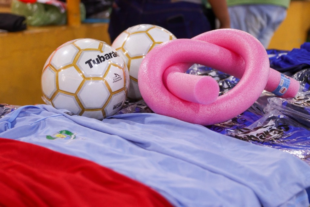 Para os alunos de natação, os materiais incluíram flutuadores do tipo “macarrão”, enquanto as crianças do balé receberam sapatilhas e uniforme específico da modalidade.