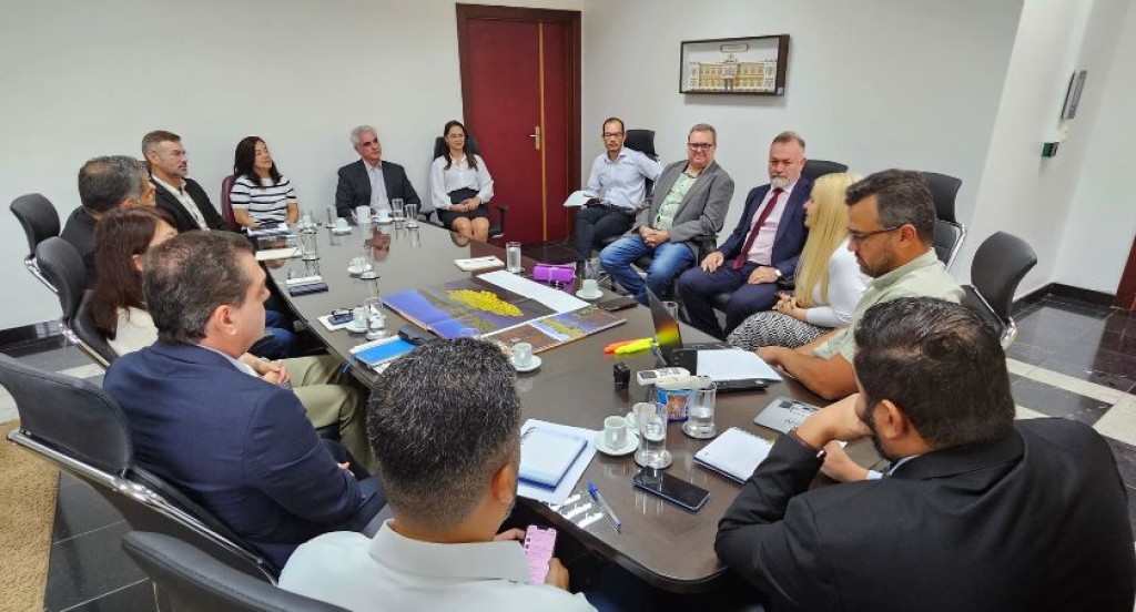 #PraTodosVerem: Foto principal que mostra uma grande sala e uma grande mesa retangular com cadernos de anotações, canetas e copos sobre ela. Sentados ao redor, estão participantes da reunião, incluindo a presidente do TRE-MT. No corpo do texto, tem outra da reunião de outro ângulo e uma, ao final, que foca o juiz auxiliar da Presidência, a presidente e o assessor, senados ao redor da mesa.
