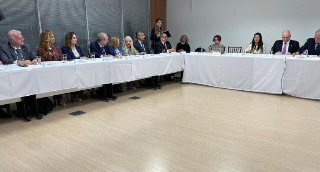 #PraTodosVerem: A primeira imagem mostra uma reunião formal, com várias pessoas sentadas ao redor de mesas dispostas em formato de “U”. Todos estão vestidos de forma social e atentos à discussão. Há copos de água sobre a mesa e uma mulher em pé ao fundo. O ambiente é claro e organizado, com clima institucional. A segunda imagem mostra um palco de evento formal do “19º Encontro Nacional do Poder Judiciário”, realizado em Florianópolis/SC. Três pessoas estão sentadas à mesa principal, enquanto uma delas aparece falando no púlpito, também exibida em um grande telão ao fundo. A mesa é decorada com arranjos florais e o cenário é institucional, com o painel do evento destacando data e organizadores.