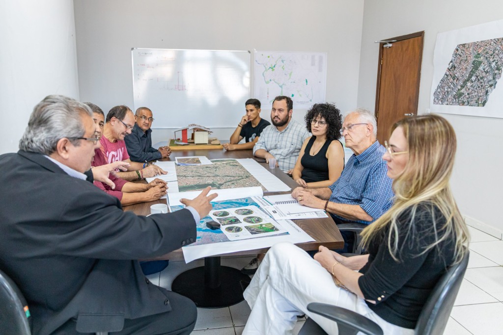 A foto mostra os participantes da reunião reunidos ao redor de uma mesa grande, devidamente acomodados.