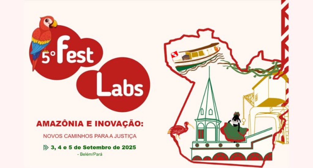 #PraTodosVerem: A imagem é um card de divulgação do 5º FestLabs, destacando o tema “Amazônia e Inovação: novos caminhos para a justiça”. O material traz elementos visuais que remetem à região amazônica, como uma arara vermelha, um barco típico, vegetação, além de símbolos de Belém, como a arquitetura do Ver-o-Peso. As cores predominantes são vermelho, verde e branco, e o card informa que o evento acontecerá nos dias 3, 4 e 5 de setembro de 2025, em Belém/Pará.