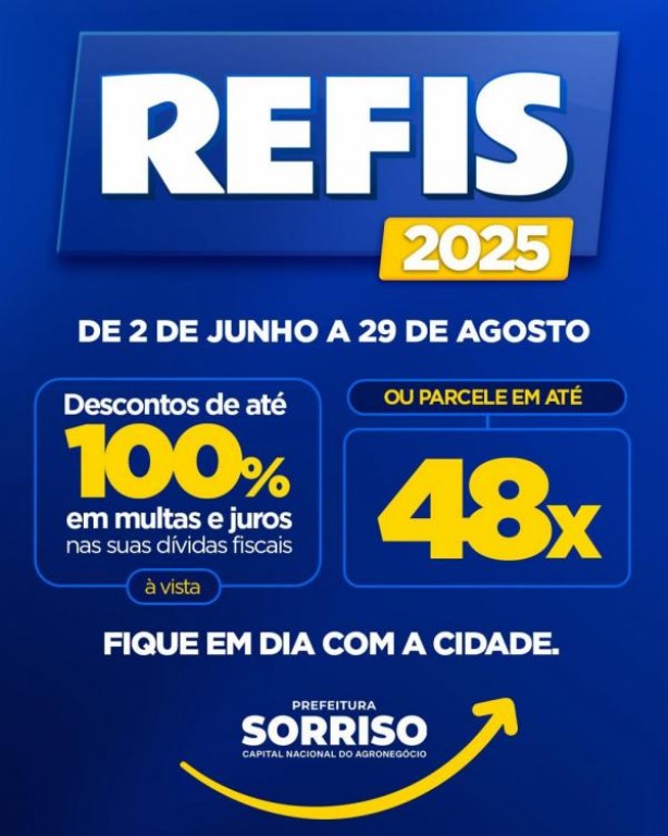 Para facilitar a renegociação, o requerimento para adesão ao Refis pode ser feito pelo site da Prefeitura (site.sorriso.mt.gov.br). Aí, é só escolher a melhor forma de pagamento neste link https://prefsorriso-mt.agilicloud.com.br/portal/sorriso/#/refis e vir até o Departamento de Tributação para homologar o acordo. O processo também pode ser feito pelo WhatsApp da Tributação, o 3545 4707.