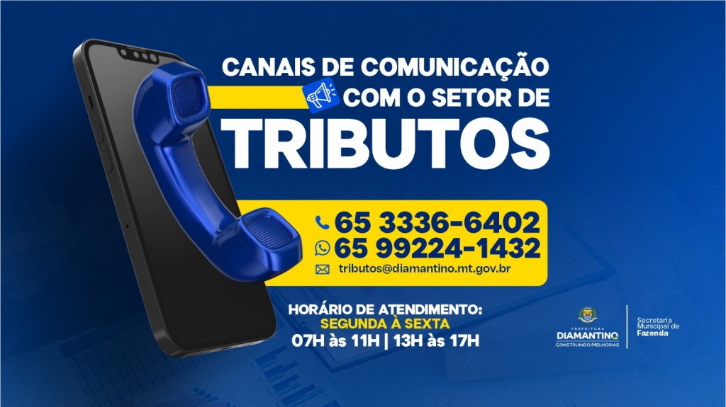 A Prefeitura de Diamantino, por meio da Secretaria Municipal de Fazenda, informa à população os canais oficiais de atendimento do setor de Tributos. Os contribuintes que desejarem esclarecer dúvidas, obter informações ou solicitar orientações sobre suas obrigações fiscais podem entrar em contato pelos telefones (65) 3336-6402 ou (65) 9 9224-1432, ou ainda pelo e-mail [email protected].