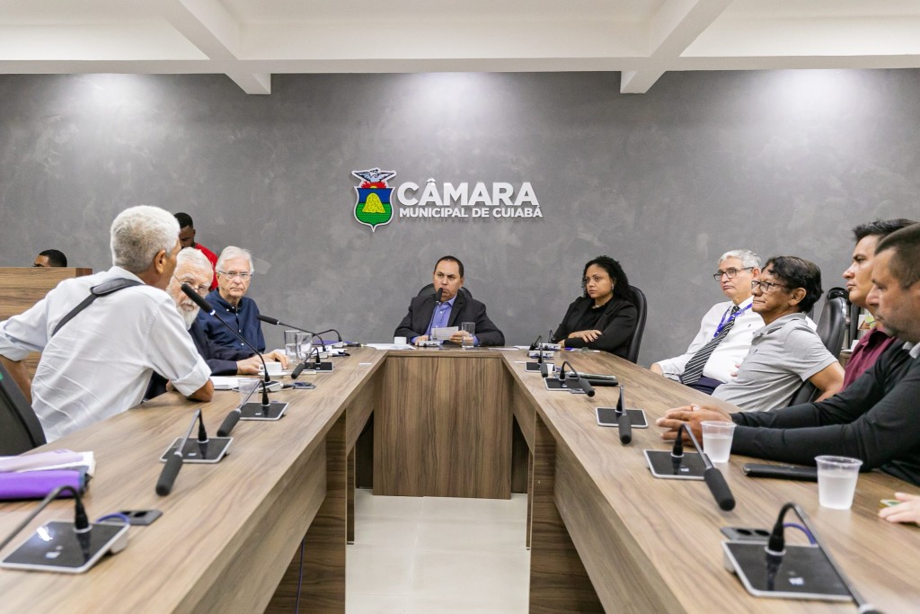 A foto mostra a sala das deliberações da Câmara Municipal de Cuiabá, onde aconteceu a audiência pública para tratar da revitalização do Parque Morro da Luz. Estão presentes o vereador Dilémário Alencar, que propôs a audiência, o secretário Municipal de Meio Ambiente, José Afonso Portocarrero e o secretário adjunto de Planejamento Urbano, José Antônio Lemos.