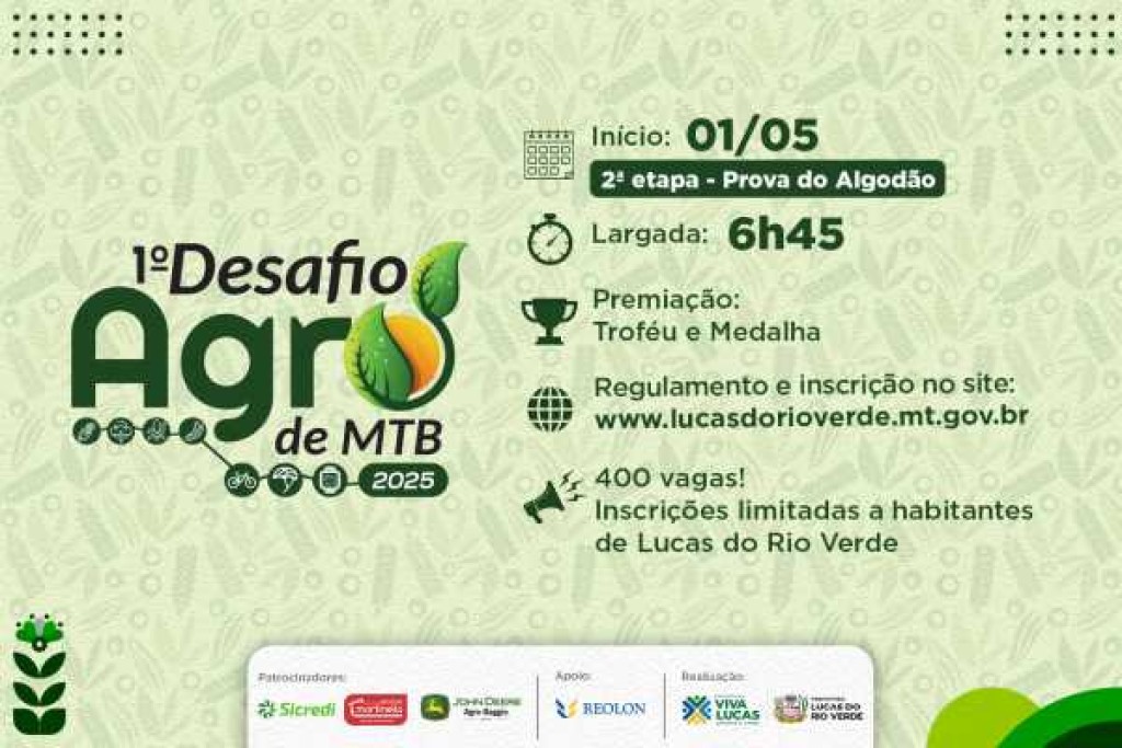 A segunda etapa do Desafio Agro de MTB “Prova Algodão” estará com inscrições abertas a partir desta segunda-feira (14), às 19h. Voltada apenas para atletas luverdenses, a etapa promete atrair ainda mais participantes, com um percurso de 60 quilômetros, em estradas rurais.
