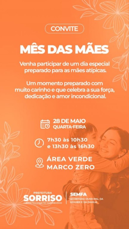 “Vamos ter roda de conversa, troca de experiências e um momento especial para salientar a força e a importância dessas mães que lutam pelos seus filhos com uma força tremenda diariamente”, frisa a primeira-dama e secretária da Mulher e da Família (Semfa), Mara Fernandes, a frente do projeto.