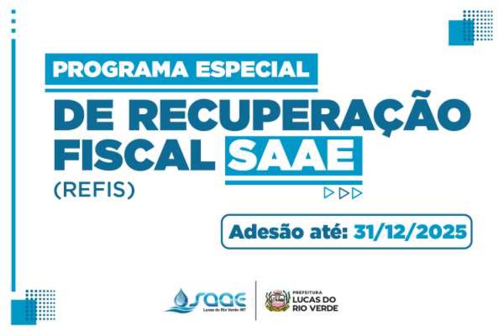 O Serviço Autônomo de Água e Esgoto (SAAE), está disponibizando aos contribuintes luverdenses pessoa física e jurídica, o Programa de Recuperação Fiscal, destinado ao pagamento de débitos relacionados ao serviço de saneamento básico vencidos até 31 de dezembro de 2024.