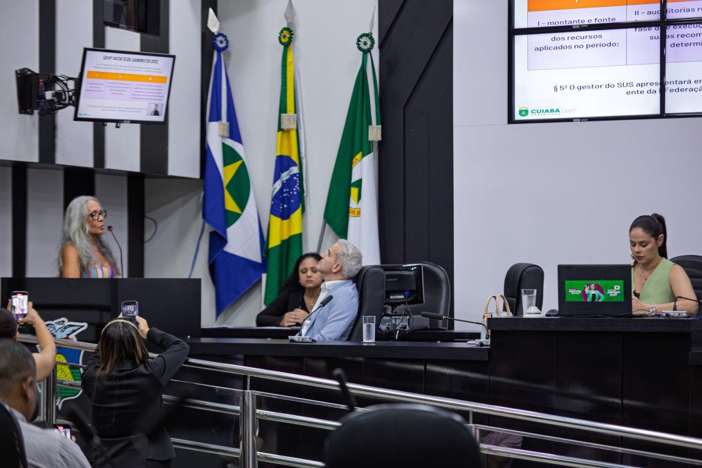 A foto mostra parte do plenário das deliberações da Câmara Municipal de Cuiabá, com a secretária municipal de saúde, Lucia Helena Barboza no uso da palavra ao público presente.