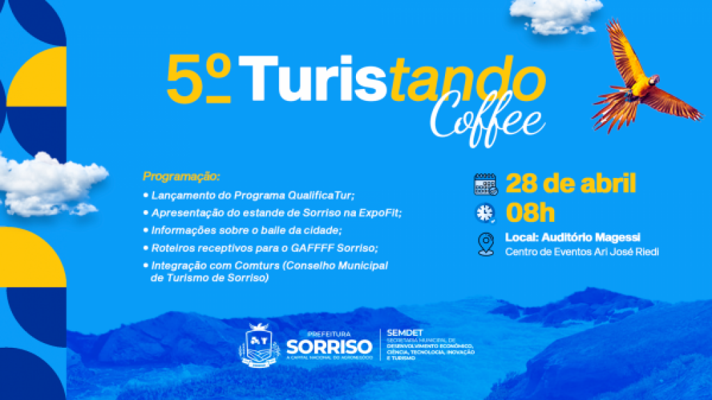 Sorriso realiza, no próximo dia 28 de abril, às 08h, o 5º Turistando Coffee, no Auditório Magessi, localizado no Centro de Eventos Ari José Riedi. A iniciativa é promovida pela Secretaria de Desenvolvimento Econômico, Ciência, Tecnologia, Inovação e Turismo e tem como objetivo reunir o trade turístico local para alinhar estratégias e fortalecer o setor.