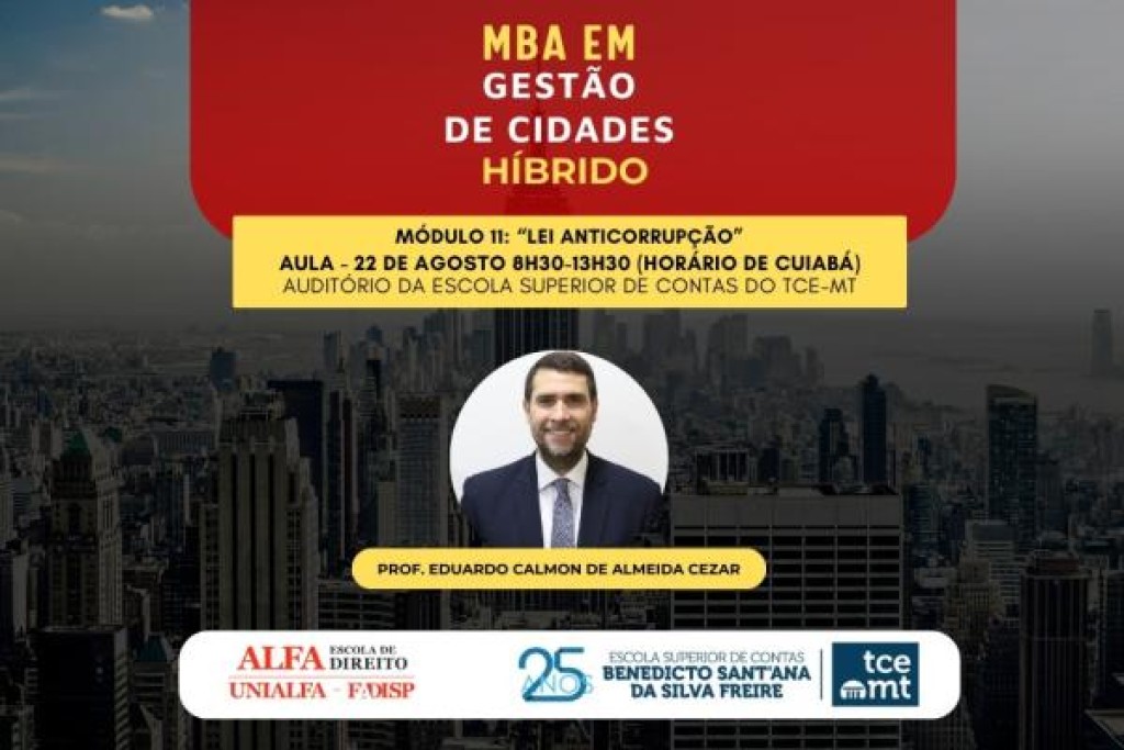 Conduzido pelo professor e juiz de direito Eduardo Calmon de Almeida Cezar, o módulo terá como tema central a Lei Anticorrupção. Entre os pontos que serão abordados estão a responsabilização administrativa e civil de pessoas jurídicas, configuração de ilícitos, atos lesivos contra a administração pública nacional ou estrangeira, interfaces sociais e testes de integridade.