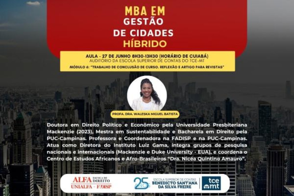 O 6° módulo do MBA em Gestão de Cidades do Tribunal de Contas de Mato Grosso (TCE-MT), que será realizado a partir das 8h30 desta sexta-feira (27), abordará metodologia de pesquisa e Trabalho de Conclusão de Curso (TCC). A aula será no auditório da Escola Superior de Contas, com transmissão ao vivo pelo Canal do TCE-MT no YouTube e pela TV Contas (Canal 30.2).