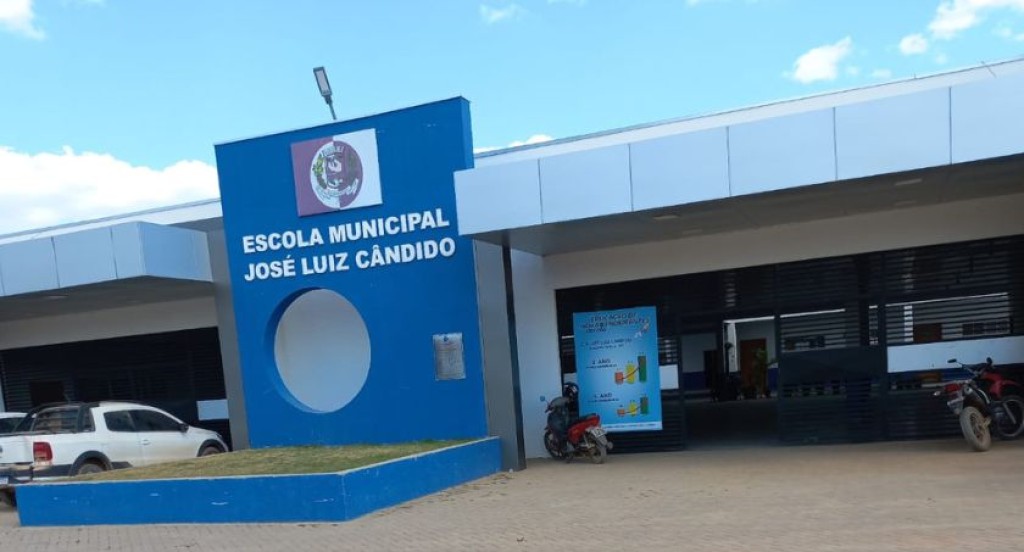 #PraTodosVerem – A imagem mostra a fachada da Escola Municipal José Luiz Cândido. A entrada principal tem uma estrutura moderna com detalhes em azul e branco. Em destaque, há um totem azul com o nome da escola e o brasão municipal. Na frente, estão estacionados alguns carros e motos, e o chão é todo pavimentado com blocos de concreto intertravados. O céu está claro, com poucas nuvens.