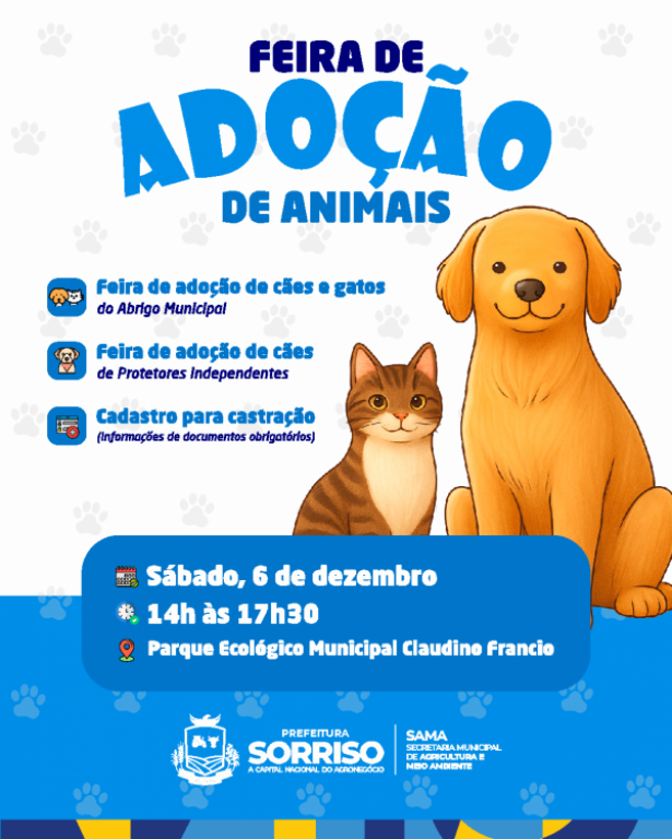A última feirinha de adoção de pets de 2025 já tem dia marcado: será em 6 de dezembro, das 14 às 17h30, no Parque Ecológico Municipal Claudino Francio. Por lá as equipes do Abrigo Municipal de Cães e Gatos, da Secretaria de Agricultura, Meio Ambiente (Sama) e representantes de uma associação de protetores independentes estarão unidas para a feira.